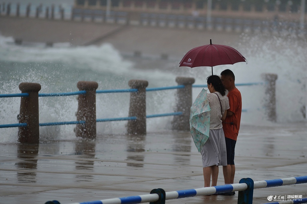 受臺(tái)風(fēng)影響青島沿海現(xiàn)大潮 游客冒險(xiǎn)觀潮戲浪
