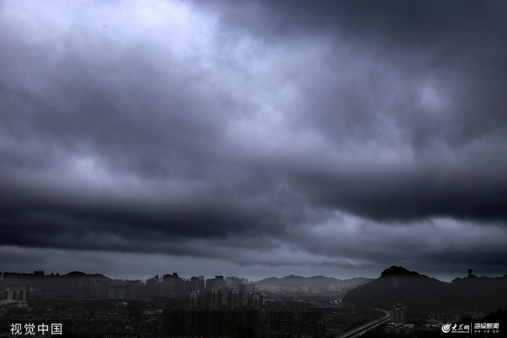 2019年8月9日上午,浙江臺州,受今年第9號超強臺風“利奇馬”逼近的影響,溫嶺市城區黑云壓城,時不時刮起強風下著暴雨,溫嶺石塘鎮和城南鎮沿海潮水掀起巨浪拍打著堤壩和礁石。