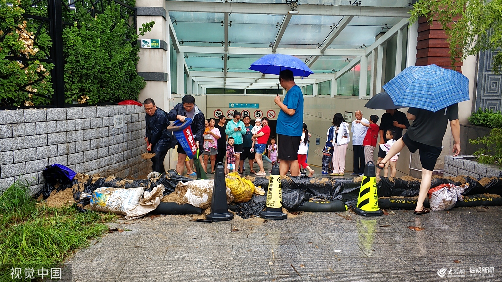 2019年8月11日,山東濱州,一小區物業在地下車庫門口,設置防汛帶。