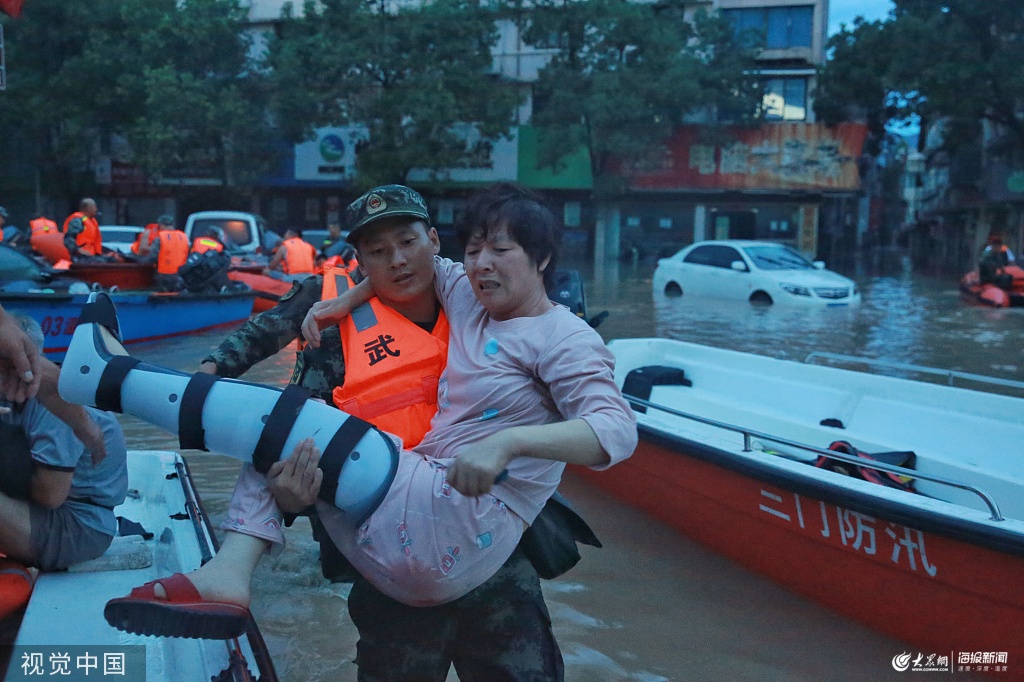 2019年8月11日5時許,受臺風影響,浙江臨海部分地區(qū)被淹,武警開展救援工作,救援人員將一位腿部安裝了支架的受困婦女抱起,轉(zhuǎn)移到安全地區(qū)。