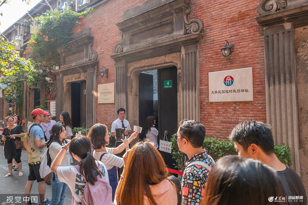2019年8月15日,上海,當(dāng)天下午,位于新天地馬當(dāng)路的大韓民國(guó)臨時(shí)政府舊址前,不斷有韓國(guó)游客前來參觀,不少講韓文的游客在“大韓民國(guó)臨時(shí)政府舊址”的字牌以及入口處自拍以及合影,同時(shí)有手持韓國(guó)國(guó)旗的導(dǎo)游帶領(lǐng)整隊(duì)游客來到現(xiàn)場(chǎng)觀光。