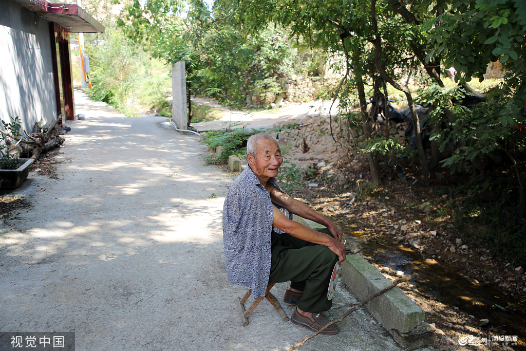 2019年9月5日至14日,在山東省日照市南湖鎮(zhèn)獅子嶺村,剛剛睡過午覺得鄭培合老人,坐在馬扎上乘涼。在他的南側(cè),一條小溪流緩緩的自東向西流過,溪水清澈,岸邊的大槐樹枝繁葉茂,形成很大的樹蔭,一陣微風(fēng)吹過,偶有幾片樹葉飄灑下來。