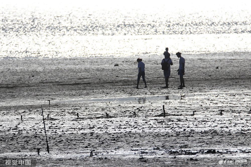 2019年9月18日,青島,退潮后的膠州灣,大片灘涂裸露,市民趕海拾趣,魚兒在淺灘里戲水,鳥兒漫步灘涂覓食,構成一幅美麗的生態畫卷。