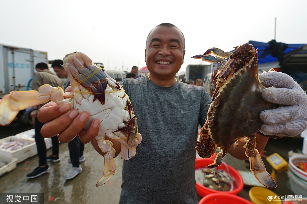在青島市一處漁港碼頭,漁民展示超過1斤重的梭子蟹。