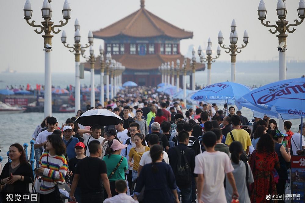2019年9月29日,青島棧橋景區游人如潮。國慶長假即將來臨,棧橋沿岸五星紅旗迎風飄揚,國慶氛圍濃厚。大批游人提前踏上長假旅游行程,逛棧橋看大海,樂享假日。
