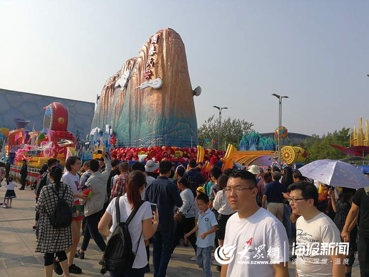 2日下午,山東彩車展演現場圍滿了前來觀看的人群,成為當天34輛地方彩車中人氣最火的一輛地方彩車。