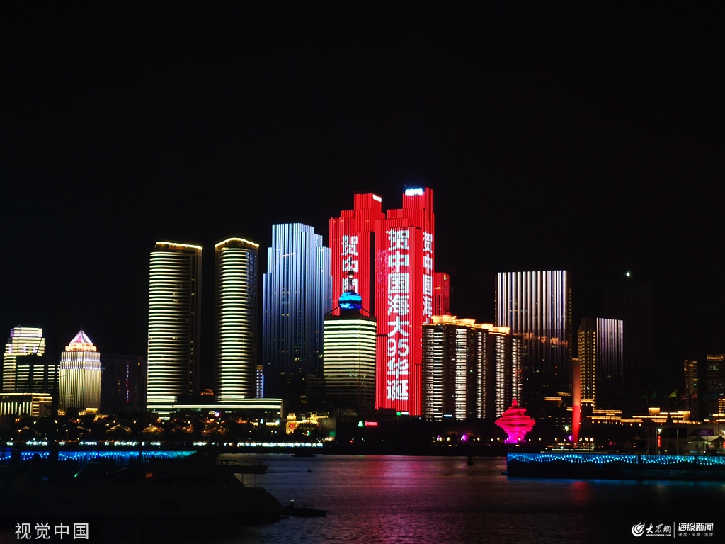 2019年10月25日,青島,以“中國海洋大學建校95周年”為主題的燈光秀正式亮相青島浮山灣。