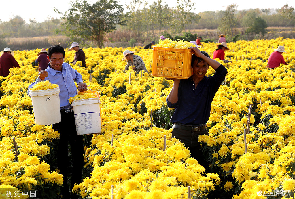 安徽滁州,在全椒縣二郎口鎮太平村,慶福種植專業合作社社員在采摘金絲皇菊。