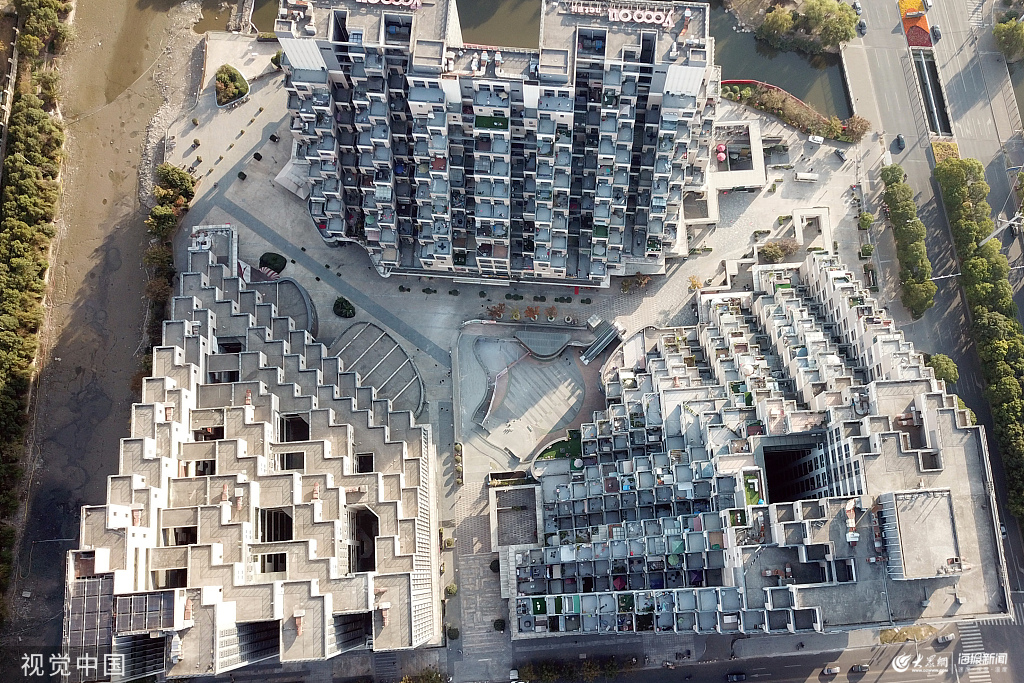 2019年11月16日,航拍江蘇昆山花橋“網(wǎng)紅”建筑,自下而上向內(nèi)縮進(jìn)的新穎設(shè)計(jì),看起來(lái)就像搭起來(lái)的積木,吸引著過(guò)往民眾的目光。 泱波(江蘇分社)/中新社/視覺(jué)中國(guó)
