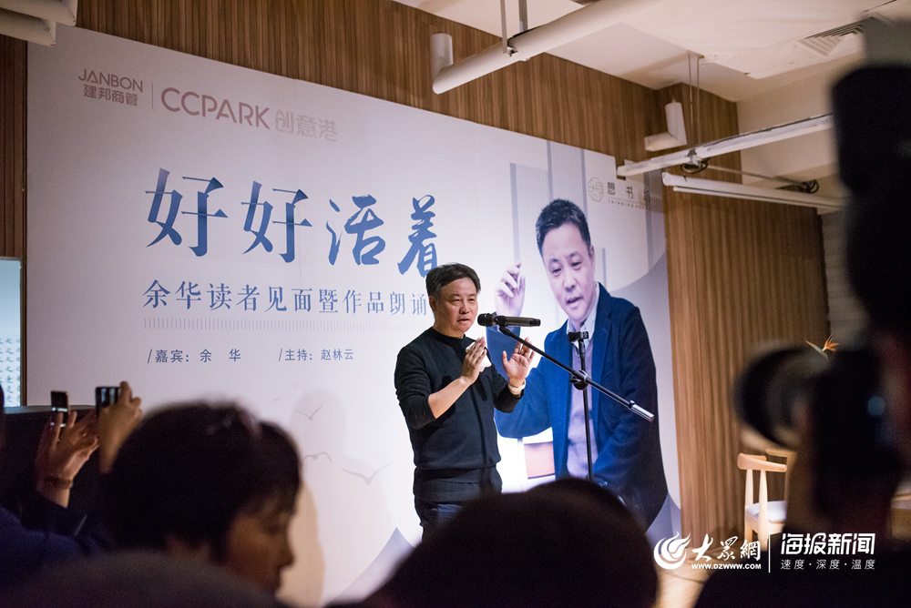 大眾網·海報新聞11月22日訊(記者 孫翔) 21日晚,著名作家余華現身山東濟南文化西路一家書店,出席“好好活著”——余華讀者見面暨作品朗誦會。與現場觀眾交流自己的創作思想。現場有觀眾問道,寫作遇到瓶頸寫不下去怎么辦?余華回答:睡一覺就好了!現場觀眾報以笑聲和掌聲。