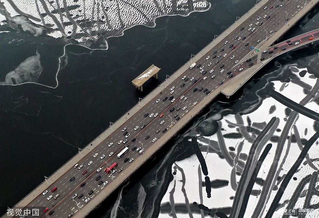 2019年12月8日,沈陽。大雪時節,渾河結冰,機動車穿梭于冰河橋上,頗為壯觀。