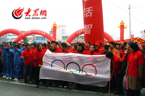 起跑點上,市民撐起奧運旗幟為長跑隊員吶喊助威