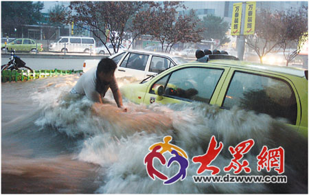 昨天18時50分左右,一名市民冒雨經過濼源大街與歷山路交叉口北側副道時,被洶涌的“洪水”沖到停滯在路中間的汽車上,后被記者和附近一家飯店的幾名店員合力救了起來。這一路段不長時間里就先后有5名行人被沖倒,記者的汽車和一輛白色桑塔納轎車被沖到路中間后連在一起,成了一堵保護涉水行人的“救護墻”。本報記者 張子森 攝影報道