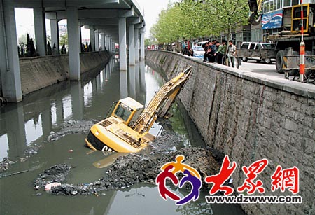 百噸吊車前來救援。 生活日報4月16日訊(記者 趙國陸)今天早上,一臺挖掘機在明湖西路的泄洪溝內清淤,不料淤泥太深,挖掘機陷入溝底不能自拔。百噸吊車前來救援,承重20噸的鋼纜一度繃斷,折騰了4個多小時,終于將這個笨重的家伙拖上岸。 上午,順河高架橋北首,一臺挖掘機歪倒在橋下的泄洪溝里,大半個機體陷入黑色的淤泥中,無法動彈。據附近的一位居民說,這兩天,該挖掘機一直在溝底清理淤泥。今天早上8點多的時候,正在施工的挖掘機突然傾斜,在松軟的淤泥里越陷越深,最后無法動彈。司機見狀,只好熄火,爬出駕駛室,順著吊臂爬到岸上。他說,可能底下有坑,不知情才栽了。 上午11點多,一輛100噸的大型起重機開到河岸邊救援,工人用木枕墊起支腿,吊臂緩緩地放下鋼絲繩。3名工人爬到溝底,將吊鉤固定在挖掘機上。隨著機器轟鳴聲,吊車開始慢慢地起吊,“砰”的一聲響,承重20噸的鋼絲繩突然斷了,挖掘機又掉下去了。 圍觀的群眾不約而同地長噓一聲。起重機把墊支腿的木枕換成鋼板,換上承重40噸的鋼絲繩,兩名工人隨著鋼絲繩再次下溝底。但新問題出現了,由于剛才固定在挖掘機上的吊鉤被拉彎,取不下來。粗鋼絲繩無法固定了。救援暫時陷入停頓。工人去找切割機助陣,將吊鉤割斷,重新固定。 下午3:45,一切準備就緒,挖掘機終于被拉上河岸。這個笨重的家伙除了弄了一身臟水外,并沒有受到損傷,可以繼續施工。