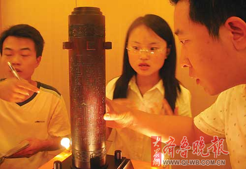 21日,由中國孔子基金會和中華遺產(chǎn)雜志社共同監(jiān)制,海峽兩岸共同創(chuàng)作的紫檀珍品百家姓《圖騰天柱》正式在山東亮相。《圖騰天柱》總高49.9厘米,重約6.9千克,柱體和底座中間藏有純金純銀打造的太極八卦,底座四周有琉璃制作的中國古代四神。作為高檔文化禮品,《圖騰天柱》在海內(nèi)外各限量編號絕版出品5000尊,在山東省限量發(fā)行200尊。 本報(bào)記者 呂華遠(yuǎn) 攝 |