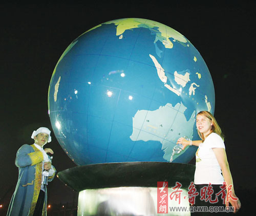 “水·地球”雕塑由直徑3米、可均勻旋轉(zhuǎn)的地球儀,代表世界五大洲的9條著名的河流模型,展示泉城風(fēng)光的旅游櫥窗,以及噴泉、燈光、音響等系統(tǒng)組成。