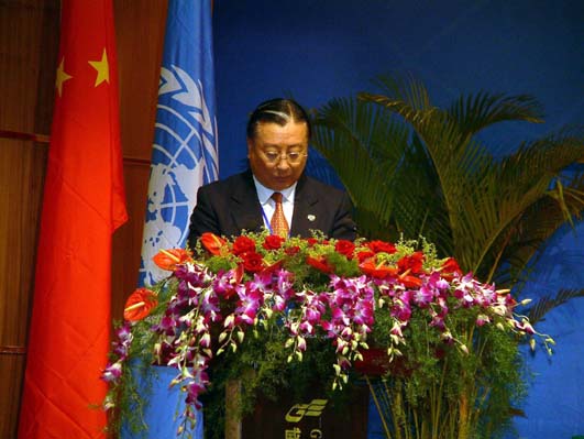 大眾網(wǎng)10月8日威海訊 今天,2004東北亞經(jīng)濟合作論壇在威海隆重開幕。圖為聯(lián)合國副秘書長、亞太經(jīng)濟社會委員會執(zhí)行秘書金學洙在論壇開幕式上致辭。(特派記者 曲濤 報道) |
