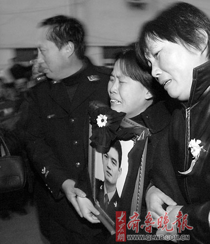 晚上6點(diǎn),當(dāng)四名武警官兵終于將靈柩運(yùn)回孟祥斌家鄉(xiāng)劉橋村,放到靈棚里時(shí),已經(jīng)坐了一天一夜火車(chē)的孟祥斌妻子葉慶華,一把拉住幾乎哭倒在地的嫂子:“不哭,我們不哭。”