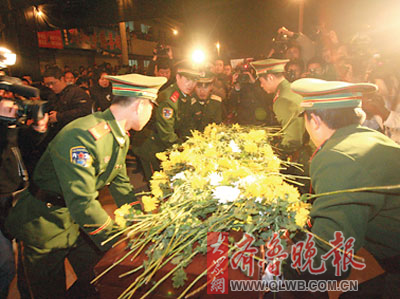 晚6時(shí),靈車駛?cè)雱虼澹舷楸蟮挠㈧`回到了生他養(yǎng)他的故土。在沉重的哀樂(lè)聲中,4名武警官兵把孟祥斌的靈柩放進(jìn)擺滿花圈的靈堂。