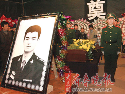 在火車站,孟祥斌的家鄉(xiāng)人為他舉行了隆重莊嚴(yán)的迎接儀式,隨后,孟祥斌的骨灰在武警官兵的護(hù)衛(wèi)下放入靈車,緩緩駛向在他的老家劉橋鄉(xiāng)劉橋村設(shè)置的靈堂。
