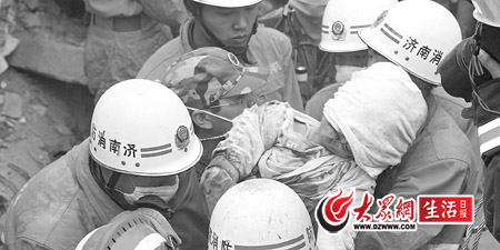 濟(jì)南市消防支隊(duì)副支隊(duì)長(zhǎng)王茁飛馬上指揮隊(duì)員搜救。“隊(duì)員們用搜救犬、生命探測(cè)儀進(jìn)行搜救,聽到廢墟下面有微弱的呼救聲。”通過(guò)進(jìn)一步勘查,救援隊(duì)員發(fā)現(xiàn)尚婷被埋得很深,她的上面有三層水泥預(yù)制板,預(yù)制板的中間還夾雜著石塊。