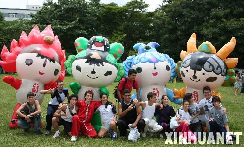 2月17日,在巴西首都巴西利亞,當地青年與充氣福娃合影。當日,中國新年慶祝活動在巴西利亞新命名的“世界和諧廣場”舉行,中國駐巴西大使陳篤慶、巴西利亞市市長庫提尼奧與觀眾們一起觀看了舞獅、功夫和中國歌舞等表演。 新華社記者趙焱攝