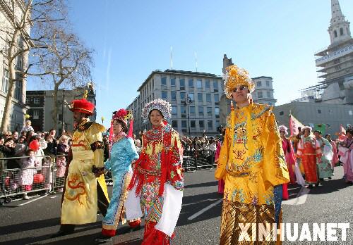2月10日,新春游行的隊伍行進在英國倫敦街頭。當天,倫敦舉行一系列活動,慶祝中國農歷新年。 新華社記者謝秀棟攝