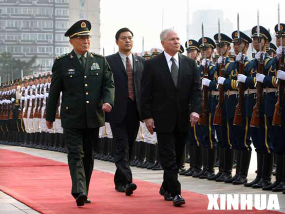2007年11月5日,中華人民共和國中央軍委副主席、國務委員兼國防部長曹剛川上將為來訪的美國國防部長羅伯特·蓋茨舉行歡迎儀式。 新華社記者 李濤 攝