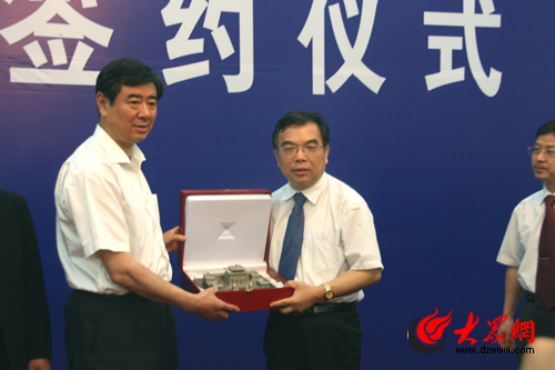 山東省經貿委主任郭述禹、武漢大學副校長謝紅星代表雙方簽約