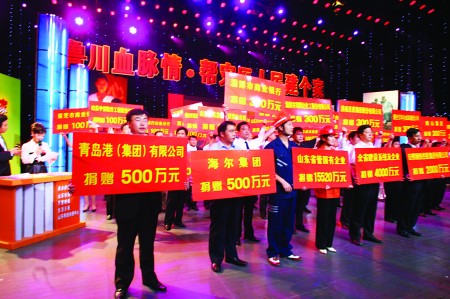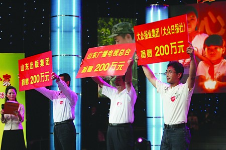 本報訊“我們現在做不到以命換命了,就讓我們以心換心吧!”昨天晚上,“魯川血脈情·幫災區人民建個家——山東省宣傳文化系統大型賑災義演募捐活動”帶動了現場社會各界代表一輪又一輪的捐款高潮。中國建設銀行山東分行、中國農業銀行山東分行、中國工商銀行山東分行、新華人壽保險山東分公司等單位都是二次捐款,且都超過了100萬元。山東省福利彩票發行中心向地震災區捐善款200萬元。海爾集團更是在先期捐款捐物1437萬元的基礎之上,又在直播現場為災區捐獻了500萬元人民幣。