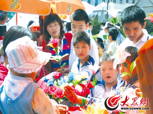 當(dāng)智障兒童真誠的眼神出現(xiàn)在他們手制的鮮艷絹花后邊,為一個遙遠(yuǎn)的地方義賣時,5月30日下午的洪樓廣場不能不令人動容。當(dāng)日,由山東省聾人協(xié)會、省智力殘疾人及親友協(xié)會、省精神殘疾人及親友協(xié)會、山東建筑大學(xué)法政學(xué)院共同舉辦“山東省殘疾人支援北川賑災(zāi)義賣”,100多名聾人、智力殘疾人義賣自創(chuàng)書畫和自制手工制品,籌得的8000多元將通過省殘疾人福利基金會發(fā)往災(zāi)區(qū),用于幫助北川受災(zāi)的殘疾人。