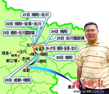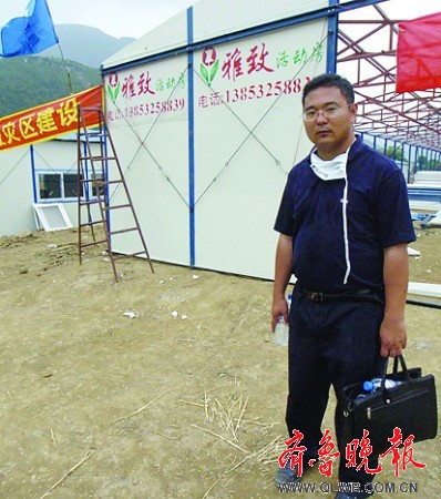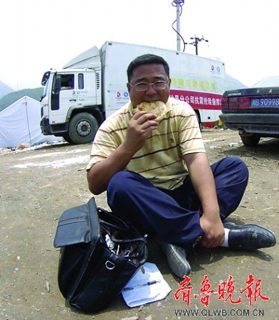 從5月24日起,這里牽動了千萬山東人的心。山東援建北川的首個項目——活動板房在這里安裝。擂鼓鎮(zhèn)也就成了我的采訪據(jù)點。這里條件很艱苦,沒水沒電,只是一片荒地。不過有了挨餓的經(jīng)驗,再去擂鼓鎮(zhèn)采訪,路上買了干餅,帶上兩瓶礦泉水,吃起來也很不錯。