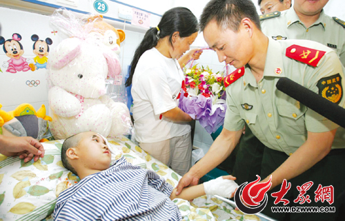 5月28日,濟(jì)南消防支隊(duì)參加四川地震災(zāi)區(qū)映秀搶險(xiǎn)救援的官兵來到濟(jì)南中心醫(yī)院,看望他們救出的女孩尚婷。