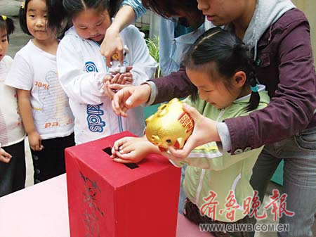 16日,七里山街道辦事處中心幼兒園的200多位小朋友為四川地震災(zāi)區(qū)捐款。 桑海波 張國(guó)穎 白光燕 攝