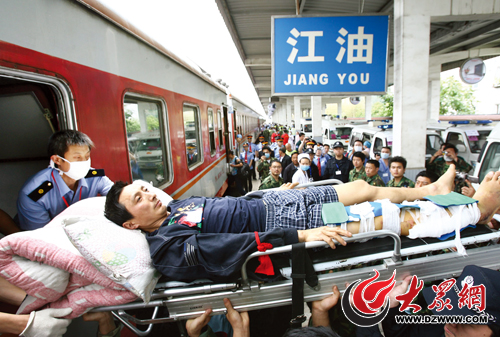 □記者 李勇 報道 本報綿陽5月21日訊 今天中午,隨著一位雙下肢骨折的傷員被抬上山東急救救援車隊的救護車,災(zāi)區(qū)規(guī)模最大的一次傷員轉(zhuǎn)運活動開始,300名傷員將被送往昆明繼續(xù)治療。 上午9點,包括山東救援車隊28輛救護車在內(nèi)的100多輛救護車在江油市集結(jié)。中午12點,急救車開始在江油幾個傷員集中收治的醫(yī)院裝載傷員,之后駛往江油火車站。此時,來自昆明幾家收治醫(yī)院的137名醫(yī)護人員也已在火車站集結(jié),他們的任務(wù)是途中護送傷員。 下午2時,在當(dāng)?shù)伛v軍戰(zhàn)士、公安、乘務(wù)員和志愿者的努力下,300名傷員順利登上專列,無一名傷員發(fā)生意外。