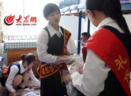 濟南幼兒師范的志愿者忙碌著為弟弟妹妹分發(fā)生活用品