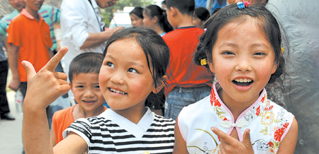 5月27日,四川省綿陽市龍門鎮(zhèn)青霞村的劉雅詩(右)與同伴鄧小雨在路邊玩耍。 四川地震災區(qū)的孩子們目前得到妥善安置,他們將在安置點度過一個特殊的兒童節(jié)。 新華社發(fā)