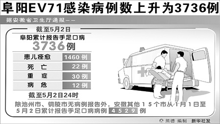 新華社合肥5月3日電(記者 代群)記者日前從安徽省政府新聞辦2日舉辦的新聞發布會上了解到,從5月2日零時起,阜陽市對手足口病全部實行了網絡直報。 安徽省衛生廳副廳長徐恒秋說,網絡直報是衛生系統內部的一種疾病網絡報告制度。這一網絡覆蓋到所有醫療機構,即便是農村鄉鎮衛生院在發現異常情況后,也可以將相關情況直接通過網絡向上級報告,縣、市、省和衛生部等各級醫療機構可以在同一時間獲知情況。 截至5月1日24時,阜陽市累計報告病例3321例,死亡22例;住院治療978例,其中病重48例。
