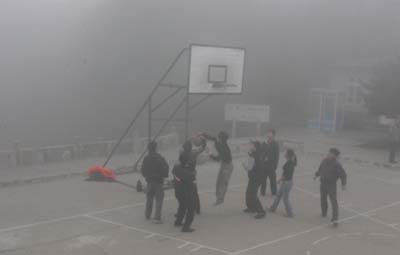 參加“網絡媒體安徽行”的記者在濃霧籠罩的籃球場上進行了一場籃球比賽。這個籃球場海拔有1600多米,據了解,這是我國東部海拔最高的籃球場。 |