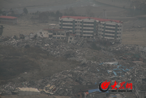 1月22日下午,本網(wǎng)志愿服務(wù)隊(duì)步行沿著被地震中垮塌滾落的巨石砸的坑坑洼洼的水泥路,登上北川臨近小山頭,俯瞰整個(gè)在地震中顛覆的北川老縣城。廢墟猶在,蒼茫的薄霧籠罩在山谷,眼前的景象難以想象當(dāng)初這個(gè)全國(guó)唯一羌族自治縣曾經(jīng)的秀美。整個(gè)北川縣城處在兩座大山中間,地震時(shí),兩側(cè)山體垮塌下來(lái)的土石掩埋了大片縣城,用當(dāng)?shù)厝说脑捳f(shuō)“縣城被‘包了餃子’”,一些地方完全見不到人類曾經(jīng)活動(dòng)的痕跡。縣城中心東倒西歪的建筑,斷壁殘?jiān)拿裾胙诼裨谀嗌持械拇髽牵瑯?gòu)成了整個(gè)北川縣城的主體景象。
