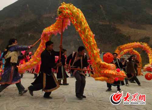 總理來到吉娜羌寨,群眾舞龍歡迎