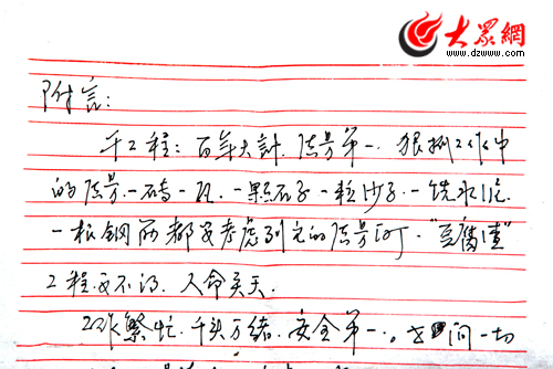 詩云:烽火連三月,家書抵萬金。今天:地震援建處,家書感人心。在淄博援建點(diǎn)北川縣香泉小學(xué)施工現(xiàn)場,記者見到了年邁父親寫給援建施工現(xiàn)場兒子的一封家書,堪抵萬金。