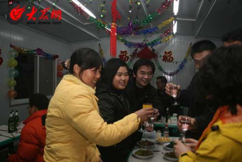 下午六點鐘,晚宴開始,小小的餐廳里,噴香的年夜飯,祝福的話語,甘醇的美酒,快樂的笑聲讓整個晚會高潮迭起。宴會上,北川中學的秦睿婷同學主動提議為大家唱一曲羌族的祝酒歌,表示對山東人民的感謝,“感謝對我們北川人民的無私幫助。”悠揚的歌聲,洪亮的嗓門,讓人遐想起羌族自治縣北川曾經的美麗。歡快的調子,質樸的歌詞,表現出羌族人民的熱情好客。