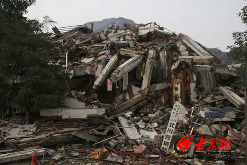 縣城已沒有完整的建筑,坍塌成一堆水泥廢墟樓房遍地比比皆是,許多沒有傾倒的大樓也是東倒西扭,五層變三層,一樓變地下室,城中原本筆直的大橋震成了波浪狀,山谷一側大山坍塌的土石沖進縣城掩埋了老城區,另一側滾落的巨石則砸碎了建筑和道路,大自然的力量讓記者一行人深深敬畏。