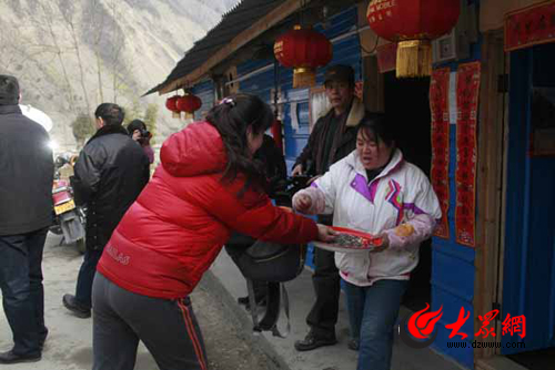 “你們就是我的親戚啊,比親戚還要親”。王榮華大娘聽說山東人來給他拜年了,趕緊從板房里迎出來,請大家進屋子暖和暖和。說話間,王大娘從家里唯一的櫥子里掏出一盤子瓜子,拿出來分給大家。一旁的小孫女眼饞要過來吃,被她支到一邊。記者知道地震后這些東西也不富裕,王大娘把這些留下招待客人吃。