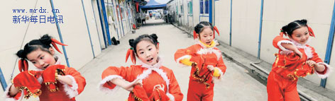 ▲1月25日,小演員演出前在板房間練習。當日,四川省彭州市通濟鎮舉辦一場文藝演出,吸引災區群眾前來觀看,為群眾增添了節日氣氛。新華社記者王建華攝