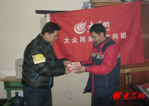 大眾網(wǎng)1月27日訊 今天,大眾網(wǎng)將愛(ài)心網(wǎng)友捐款4300元作為“壓歲錢(qián)”捐贈(zèng)給北川中學(xué)的43名孤兒。北川中學(xué)老師肖志敏代表北川中學(xué)對(duì)大眾網(wǎng)及網(wǎng)友的愛(ài)心表示感謝,并代表學(xué)校向大眾網(wǎng)網(wǎng)友表示崇高敬意。網(wǎng)友捐贈(zèng)的善款是新年里孩子們收到的一份有特殊意義的“壓歲錢(qián)”。圖為大眾網(wǎng)總編輯助理、采編總監(jiān)曲濤將善款交給肖志敏老師。(記者 陳宏發(fā) 攝影報(bào)道)