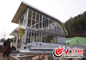 一座被四川災民稱為“最牛的抗震房”春節前夕在地震受災最重的北川縣永安鎮路邊崛起。這座由新加坡和成都合資公司建起的樣板房, 采用新西蘭技術,電腦設計,國產合金材料和抗壓裂建材,為三室一廳兩層式。同類房屋已經在泰國、伊朗和印尼災區重建的廉價屋區廣泛應 用。
