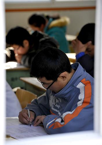 北川縣桂溪中學初三學生在板房教室內進行期末考試(1月13日攝)。北川在生長:崎嶇山路上穿梭的載重汽車、群山環抱中轟鳴的機器聲、日益增多的新建農房和置辦年貨準備過年的群眾都見證著北川的生長。那個撕心裂肺的午后已經過去8個多月了,在對口援建的山東省幫助下,四川省北川縣已啟動鄉鎮駐地援建項目112個,重建工作正有序展開。截至2008年底,山東省累計投入北川援建資金12億多元,并積極幫助北川招商引資,建設工業園區,變“輸血”為“造血”,為當地進一步重建發展提供動力。新華社記者朱崢攝
