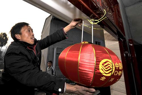 北川縣香泉鄉四組村民仇書才在新房上懸掛燈籠(1月14日攝)。新華社記者朱崢攝
